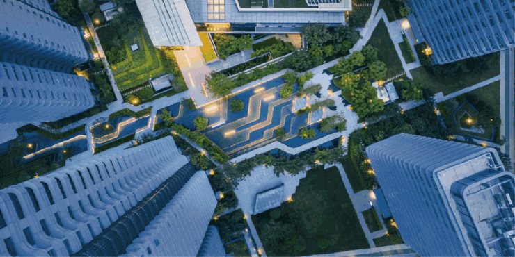 当夜幕降临,树池灯低矮而温柔,洗墙灯打亮墙面,楼栋号都散发着温润的灯光,勾勒出回家的路径。