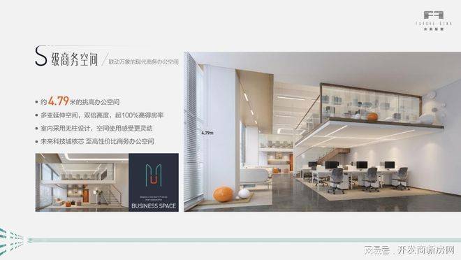 产品拥有4.79米稀缺奢阔层高,突破式的层高设计,使得装修风格可更加灵活多变,大气恢弘的立体空间,是企业形象气质达到更高一层领域的表现。4.79米层高还可做隔层设计,打造成为您企业的展示空间、仓储空间、休憩空间等、实现多重办公可能。同时未来星辰还拥有极致的户型设计,方正的户型、无柱设计,都将带来更高的空间利用率,使企业轻松分割布局随心设计,不浪费每一寸空间