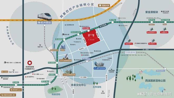 项目位于国家级开发特区未来科技城的核心区域,北临余杭塘路,南临联创街,西临聚橙路,东临新桥路,地铁5号线永福站上盖,项目南侧800米为阿里巴巴集团全球总部,西侧3km为欧美金融城、距离国家5A旅游景区西溪湿地也仅4km,区域位置极佳。板块内依托其创新产业基础,以信息技术、互联网、科技金融、智慧大健康、科技服务产业为核心,聚集了像阿里巴巴、菜鸟网络、字节跳动、水晶光电、 OPPO等众多独角兽企业和全球巨头总部。大量龙头企业的涌入以及创新资源的有效集聚,板块内拥有着超强的产业规模和聚焦度