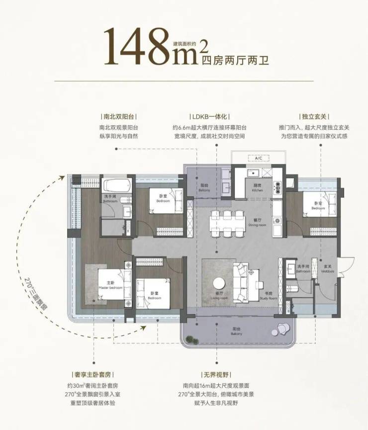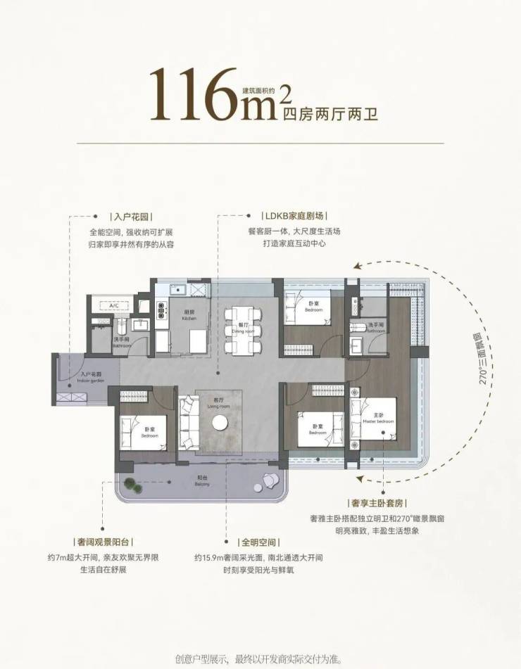 16m超大尺度观景阳台,6.6m270°观景阳台,约30㎡超大主卧,270°全景飘窗