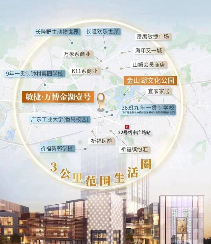 项目周边也有不少游玩的好去处,比如金山湖公园,直线距离约400米,步行可达,享受静谧湖光美景。大夫山森林公园,直线距离约2.5千米,假日休闲亲子家庭旅游胜地。长隆乐园,直线距离约2.5千米,一站式游玩。