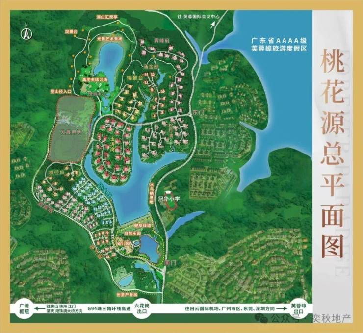 本项目东连广东省4A级芙蓉嶂旅游度假区;南距山前旅游大道约500米,珠三角环线高速公路(G94)在此设有芙蓉嶂、六花岗双出口;西拥狮岭国际皮具皮革城、广清城轨狮岭站和银盏温泉度假区;北倚风水宝地芙蓉嶂和王子山脉,背山面水,是广州十区中空气质量最好的区域,常年负离子浓度2000个/cm³,是城区的4-6倍。