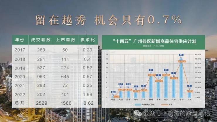 越秀区近十年几乎没有宅地放出,从过去六年的历史数据来看,新房平均供求比仅为 0.62,严重供不应求。在未来五年,越秀新房供应仅占全市的 1/130,而且在越秀区公园前,仅有君熙府这一座。