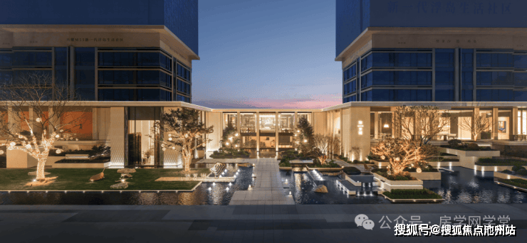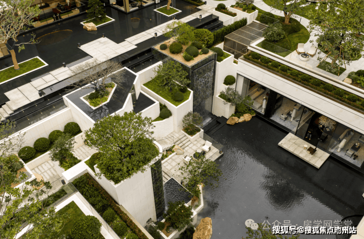 项目将大面水景置于社区前场,结合绿植、流瀑、雕塑等,构筑了令人印象深刻的入口界面。