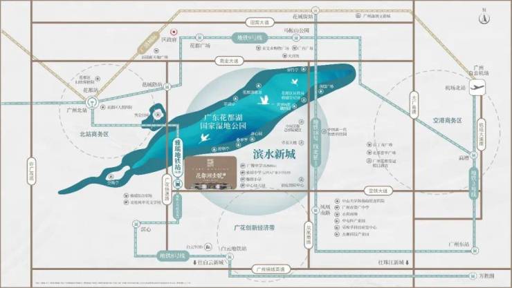 项目位于的滨水新城,已经发展近10年,入住即享区域醇熟配套。滨水新城包含花都湖沿岸和空港商务区,面积范围20万m²,规划人口达 26万,未来将建成“配套高端、生态优良、宜居宜业”功能复合的花都滨水新 城 RBD。