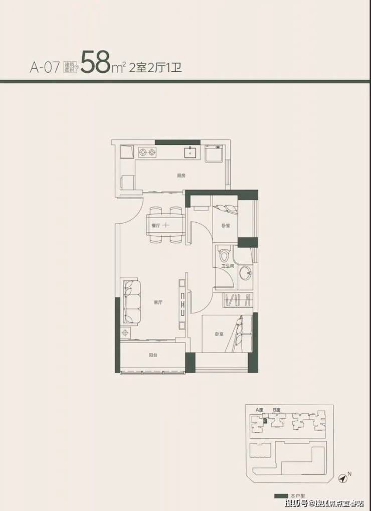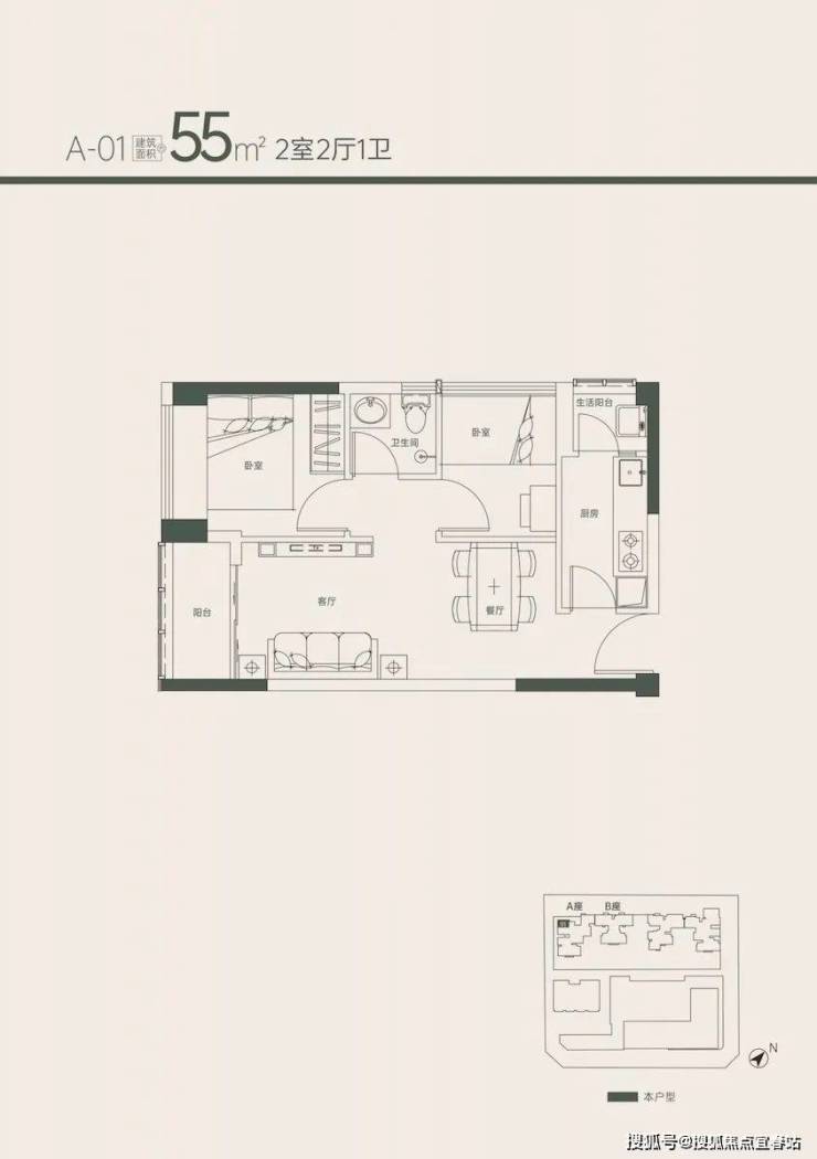 相较于55㎡户型这个两房的亮点在于厨房是真的太爽,还能设计推门整个空间看起来会比55㎡的两房大,东南向朝向也更优质。