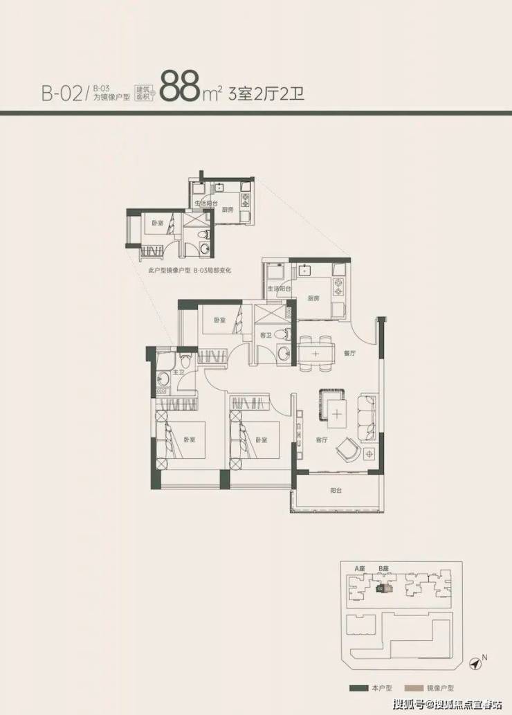 南北通透四房户型,是「京地海樾府」最大的户型,主阳台朝西北,生活阳台朝东南。同样位于1B座的2梯4户结构,这个户型只有58套,适合改善需求和周边本地人置业。