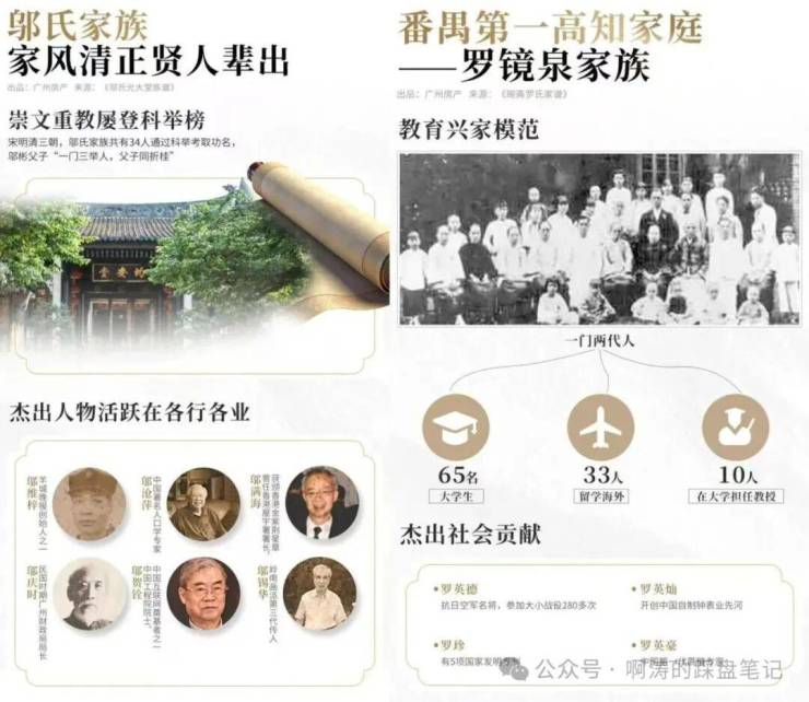 此地依托邬氏、罗镜泉两大望族,成就「改变世界,中国力量」的广府文脉中枢。邬氏以文传家,宋明清三代 34 人科举及第;邬彬父子更是一门三举人、父子同登科,佳话流传至今。家族名人辈出,在《羊城晚报》创办、互联网发展、岭南画派传承等领域皆留下深远印记,助力时代发展。