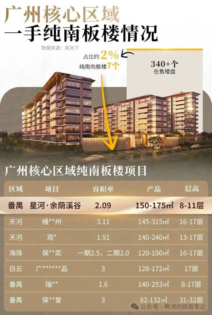 根据不完全统计,广州核心区域在售盘340多个,做到纯南向板楼的不到10个,占比仅约2%。