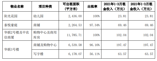 焦点财经讯 4月15日,京投发展公布2021年排名前列季度主要经营数据。 报告期内,公司新增房地产储备0万平方米;新开工面积0万平方米;竣工面积14.94万平方米;签约销售金额41.76亿元,同比增长234% ;签约销售面积9.35万平方米,同比增长21%。 公告显示公司主要房地产出租情况如下:
