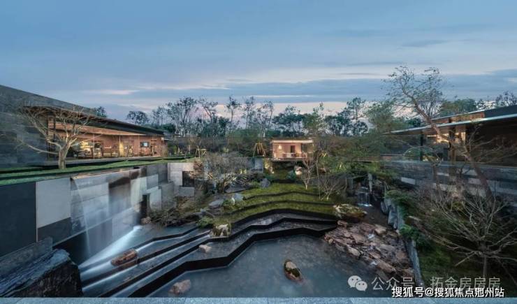 庭院利用 10 米高差,打造约 3000㎡双层立体洄游庭院,融入“池、泉、瀑、溪、涧”,仿佛置身北宋《西园雅集》画境。