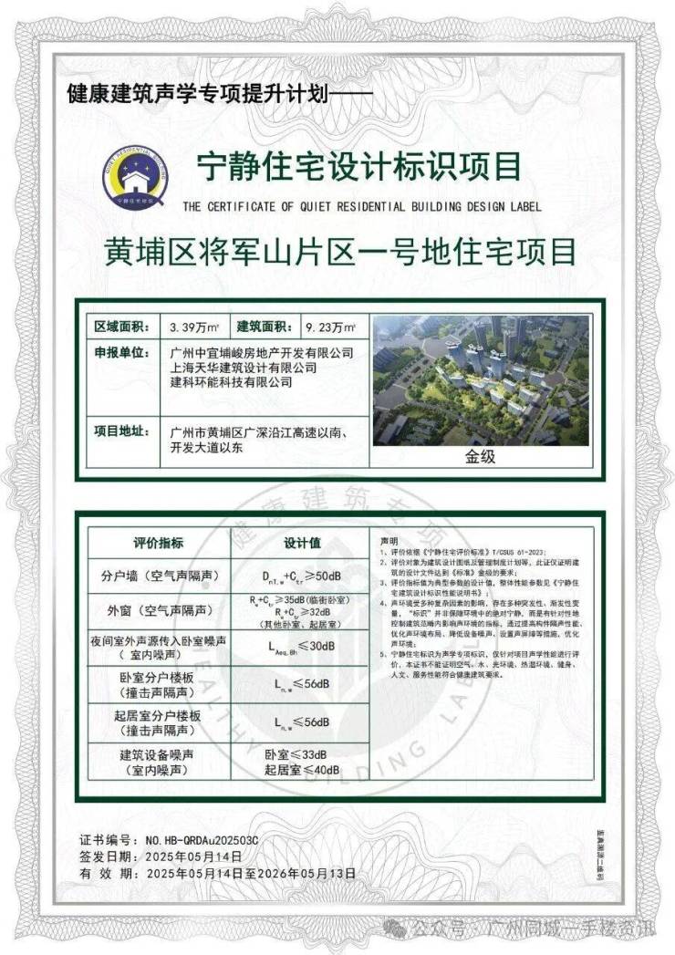 项目荣获中国城市科学研究会颁发的宁静住宅设计标识项目金奖!当城市噪音污染越来越难以隔绝的当下,黄埔未来城以五重静音系统构筑声学堡垒,打造广州罕见的"零分贝"住区,让静谧成为最奢侈的标配。