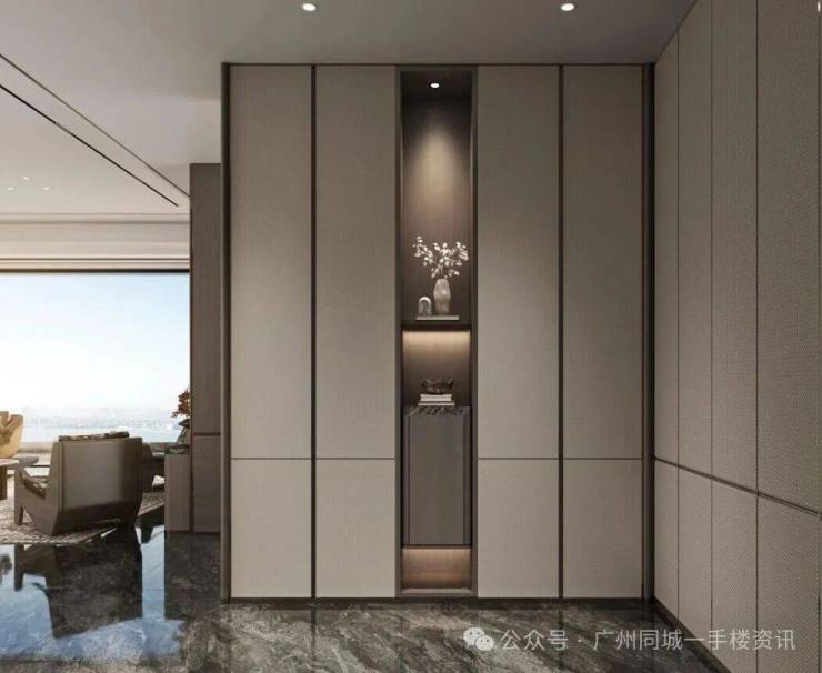 再比如,入户空间非常宽敞,足以打造一整面收纳柜、艺术柜。