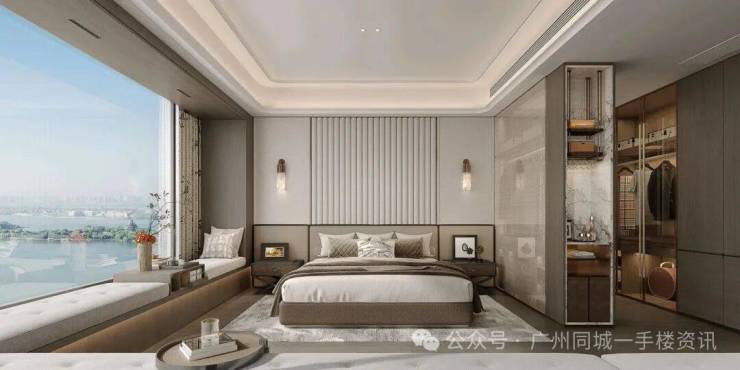 比如,带步入式衣帽间帽间和浴缸,搭配270°转角飘窗,躺在床上,也能开启广角视野。