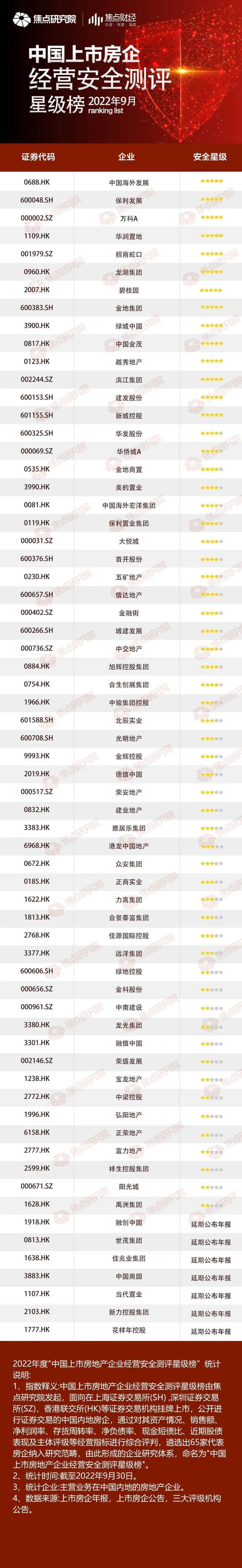 中国上市房企经营安全测评:29家获4星以上评级,5星民企仅剩4家(2022年9月)