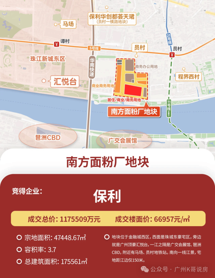 面粉厂地块位于临江大道旁,与珠城直线距离仅约600m;隔着净水厂,就是广州豪宅标杆汇悦台,二手成交单价一度超30万/平。