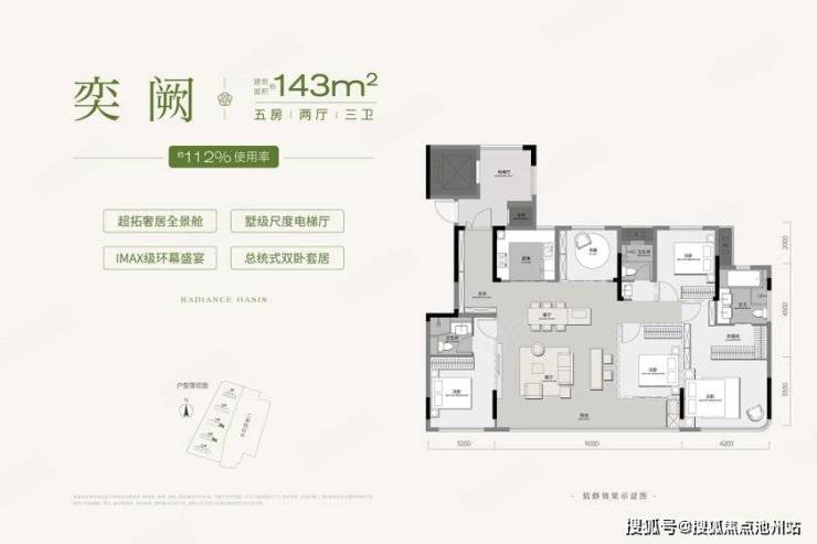 3-4#楼东边户,南北通透,四开间朝南,五房三卫结构,妥妥的空间越级。优化后使用率约112%,主卧、客厅尺度都非常大,南向两个卧室带独立卫生间。