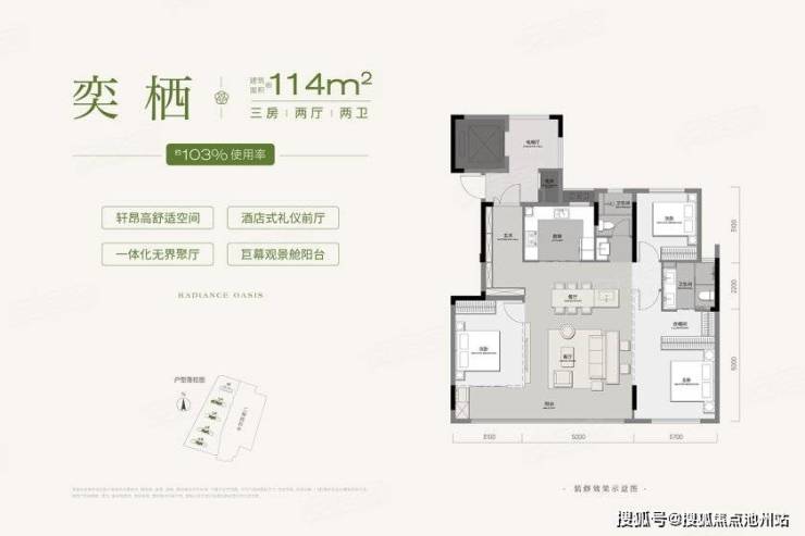 2#楼东边户、3-4#楼西边户、5#楼东西边户,南北通透,三开间朝南,优化后使用率约108%,主卧做了弧形落地窗。户型尺度很大,餐客厅一体化方厅。