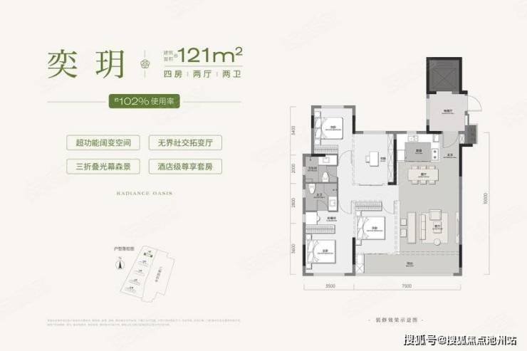1#楼边户,南北通透,三开间朝南。南向大阳台,优化后使用率约102%;四房设计,功能性强,三房、四房可自主按需切换。