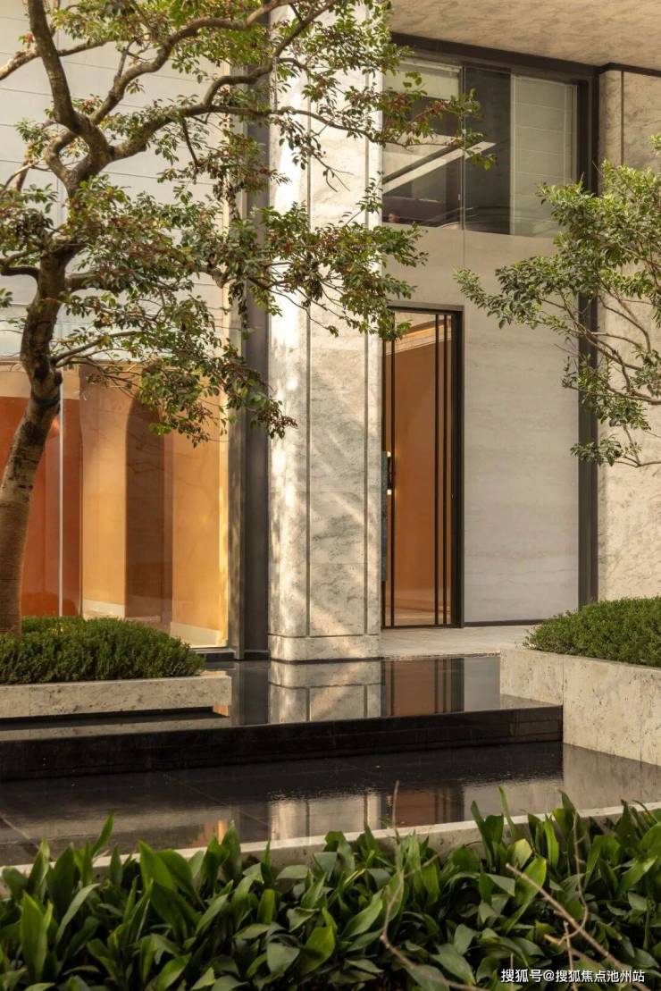 设计借鉴了立体空间理念,通过多标高平台与下沉庭院的叠合组织,突破了传统住区扁平化的空间格局,构建出层次丰富的立体庭院系统。行走于不同高差之间,视线与体验随之流转,社区因此成为一个可探索、可沉浸的“生活剧场”,在步移景异中重构人与环境的互动关系。主入口设计集中体现了“造景”与“借景”的传统园林智慧在现代社区中的创造性转化。长达近百米的沿街展示界面,通过规整的景观序列强化归家仪礼;同时巧妙将南侧河景“借”入园区,形成一道可呼吸的城市界面。由此,“河-院-宅”的水脉逻辑被清晰建立,自然气息由外至内层层渗透,赋予社区以持续流动的“生息”意向。