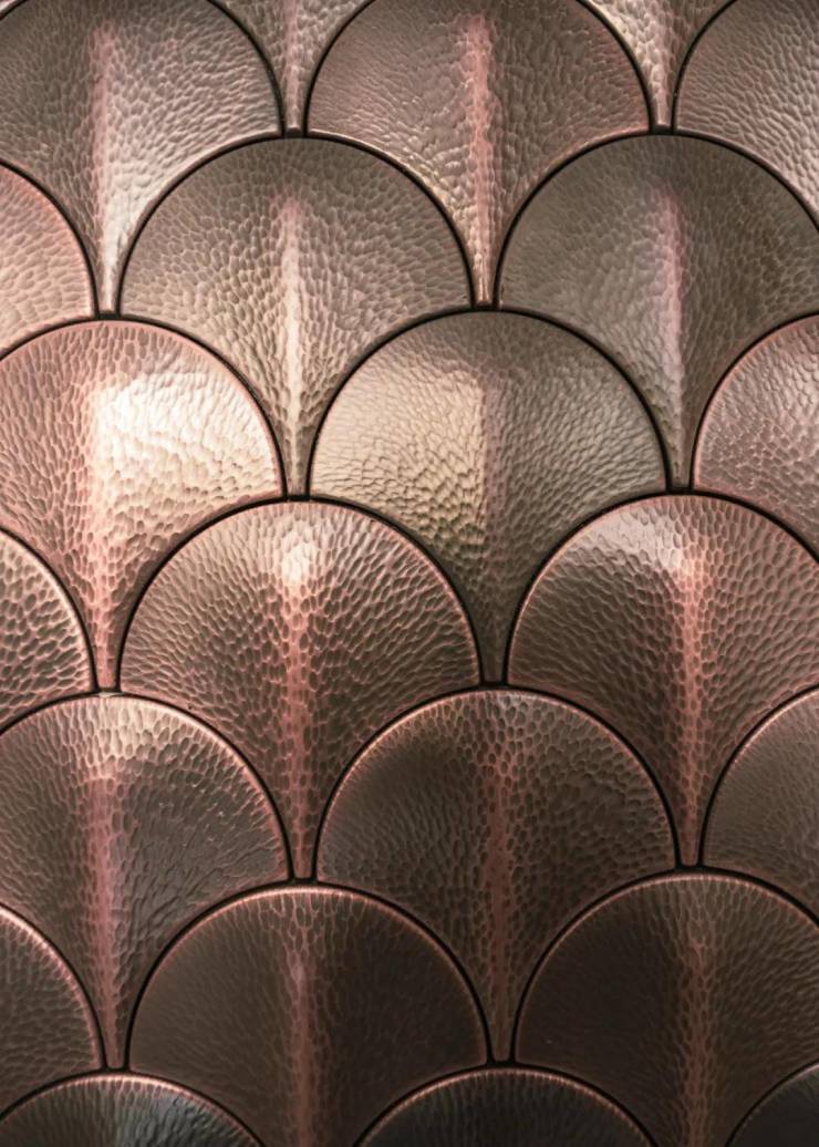 比如崇门厅,数百块铜片手工拼叠的“海潮”背景墙,从海潮永恒涌动的寓意中,传达出了家族兴旺的愿望。