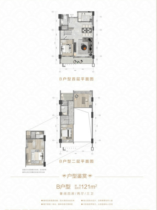 产品方面:项目一共分为两期开发,目前在售一期B4和B5小高层,涵盖了复式户型面积112到129㎡。