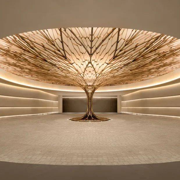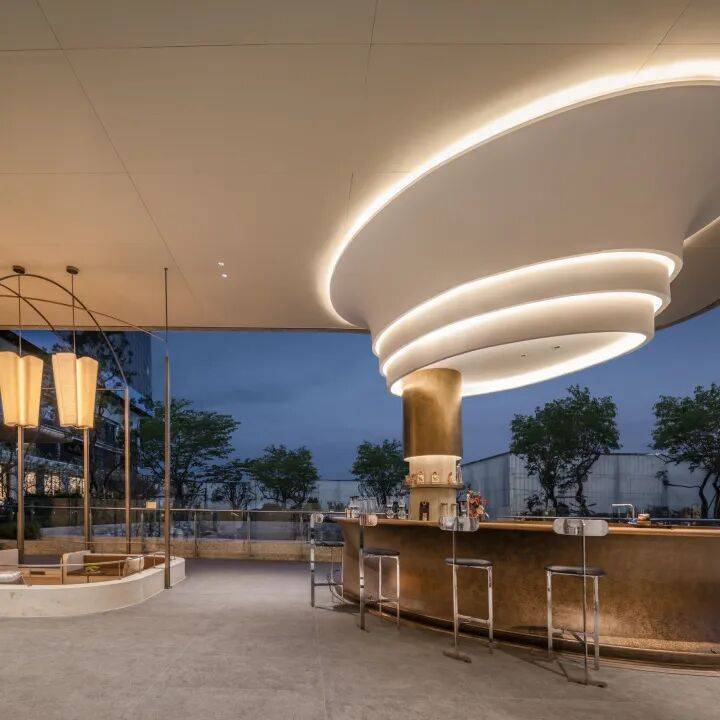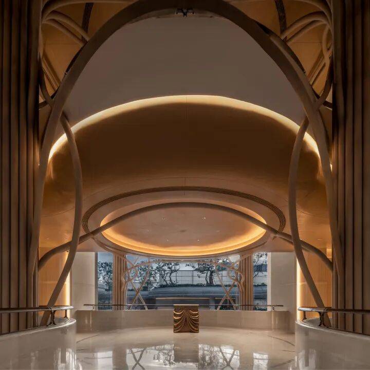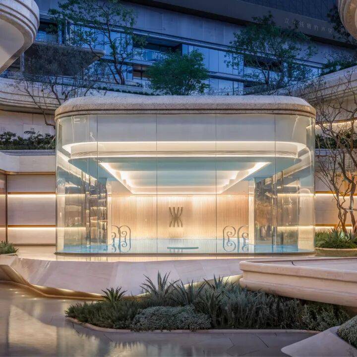 因项目整体抬高,从下沉庭院到架空层“空中花园”的落差极大,形成独特的峡谷地貌,杭序府的设计团队汲取九溪烟树为造园灵感,打造一个立体多维的城市溪谷交互园林;因项目毗邻江岸,杭序府的外立面以“站立的江潮”为灵感,