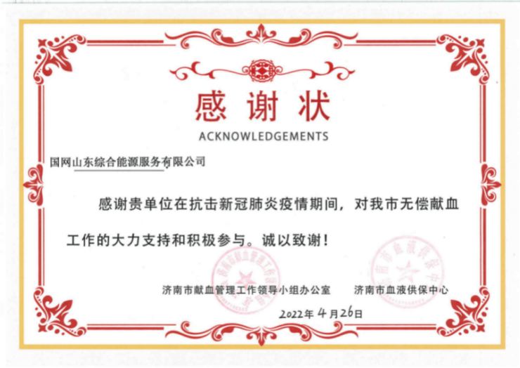 济南市血液供保中心根据公司献血人数,安排献血车辆主动上门服务,对公司在疫情期间积极发扬央企“人道、博爱、互助”精神,对医疗机构用血需求方面作出的贡献表示衷心感谢,并为公司赠送了“支持无偿献血、热心公益事业”锦旗和无偿献血感谢状。