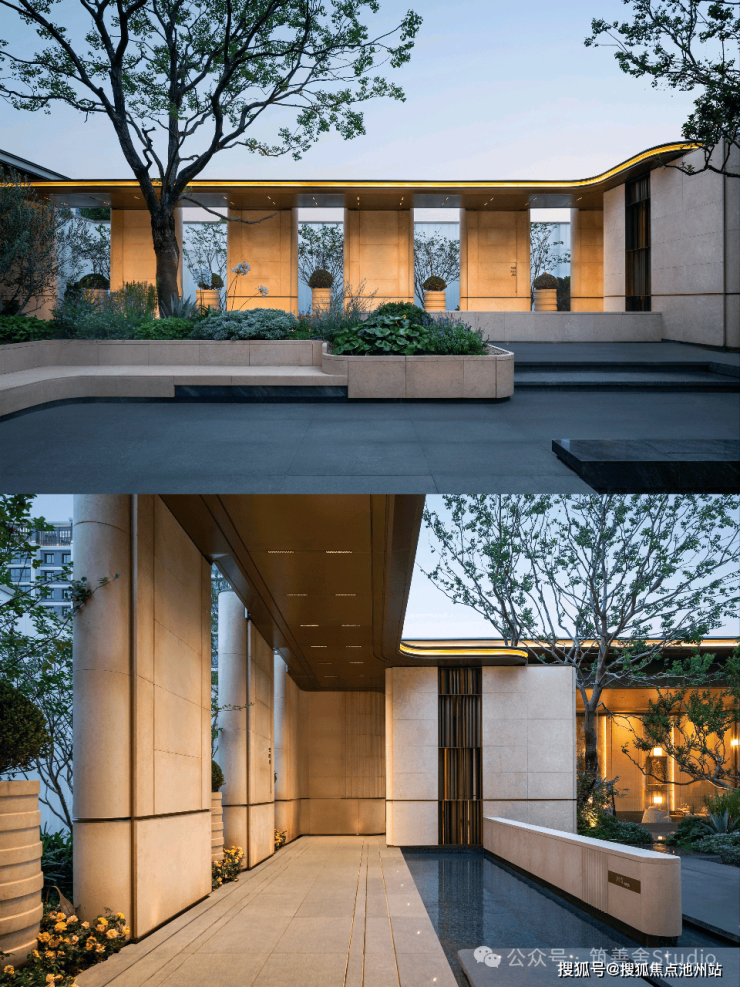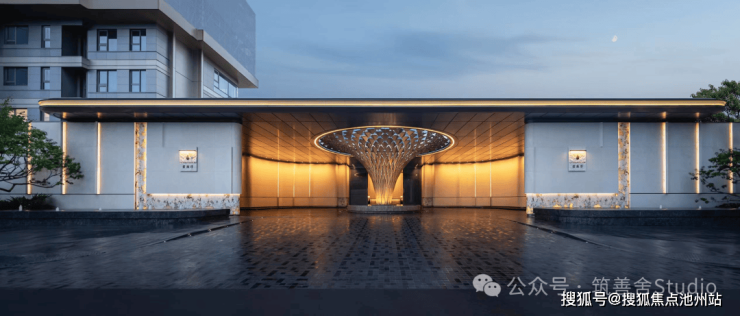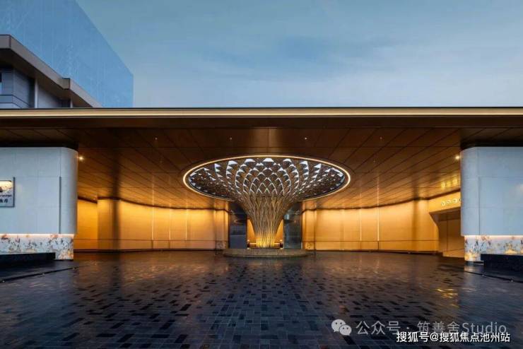 主入口设计借鉴酒店环岛落客风格,顶部巧妙开洞,艺术雕塑装置与之浑然一体,巧妙融合了天圆地方的传统文化理念。归家之路不仅彰显尊贵与庄重,更赋予了一种别具一格的仪式体验。