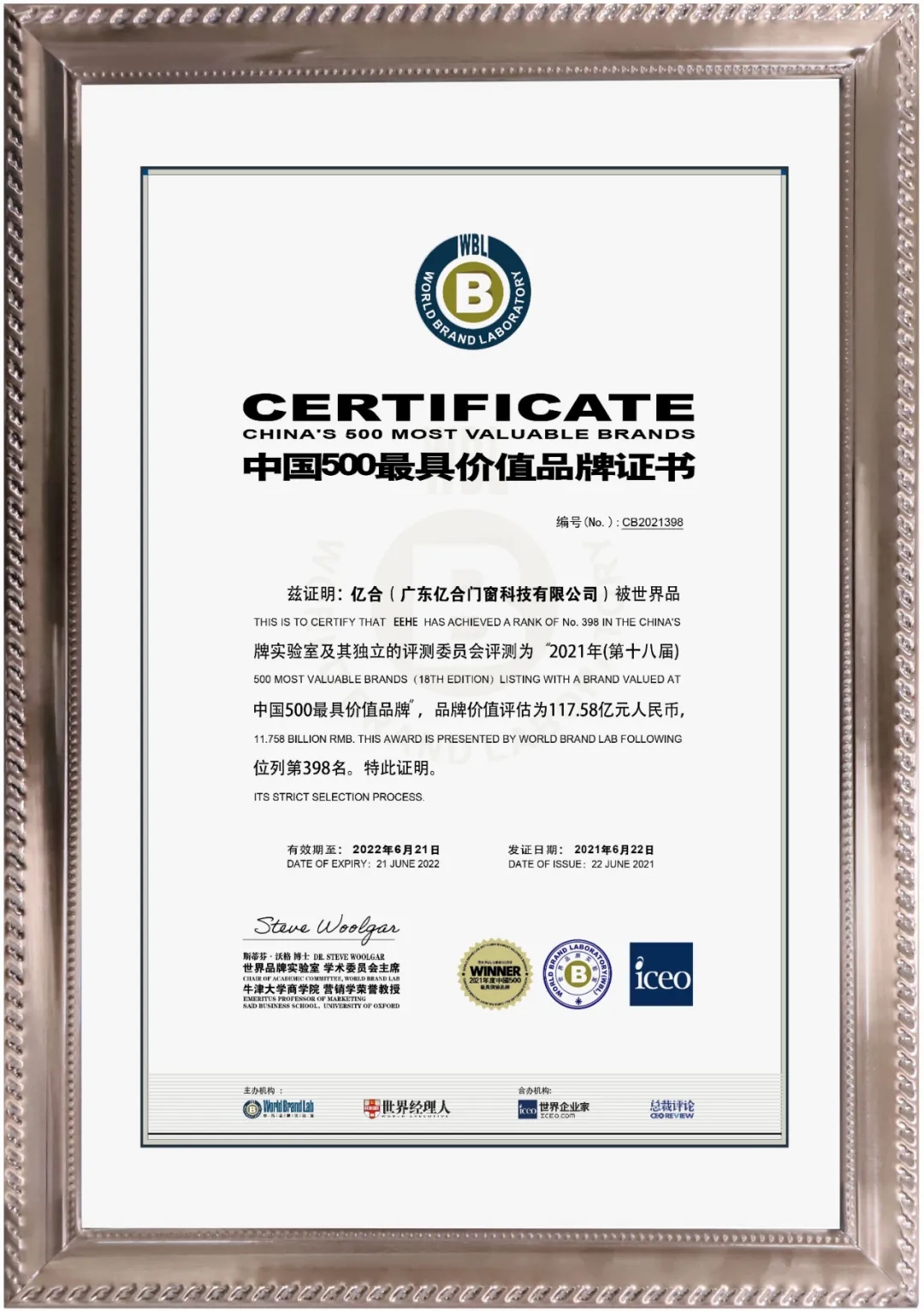 2021年6月22日,由世界品牌实验室(World Brand Lab)主办的(第十八届)“世界品牌大会”在中国北京举行,会上发布了2021年《中国500较具价值品牌》分析报告,亿合门窗117.58亿再次跻身中国500较具价值品牌。