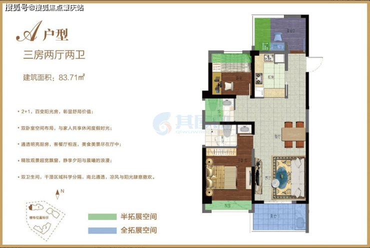 2# 楼在售户型:B 户型 85.36㎡两房两厅两卫;A 型 87.71㎡三房两厅。