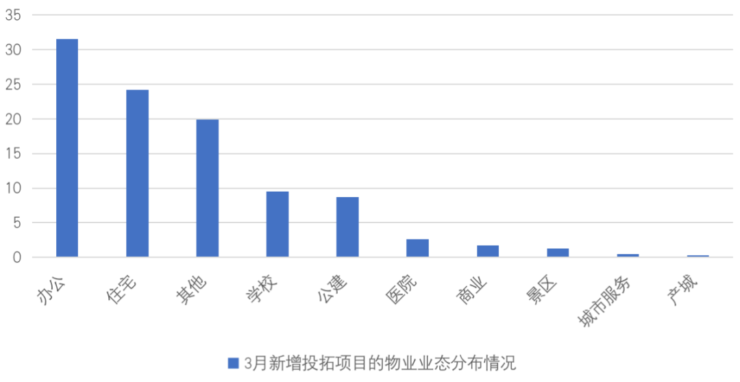 数据显示,2月与3月在业态的占比趋势非常相似,整体而言,绝大多数物企都全面开拓多元化发展路线。如绿城服务,公开数据统计显示3月其主要新增拓展26个项目,包含的业态涉及办公、公建、学校、商业、住宅等多个业态,其中主要以办公为主。